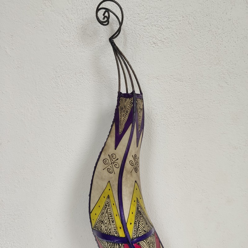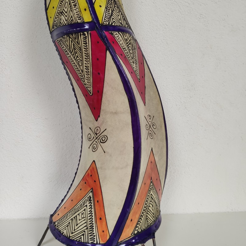 Lámpara de piel natural decorada con henna y pintada a mano en la Medina de Marrakech.
