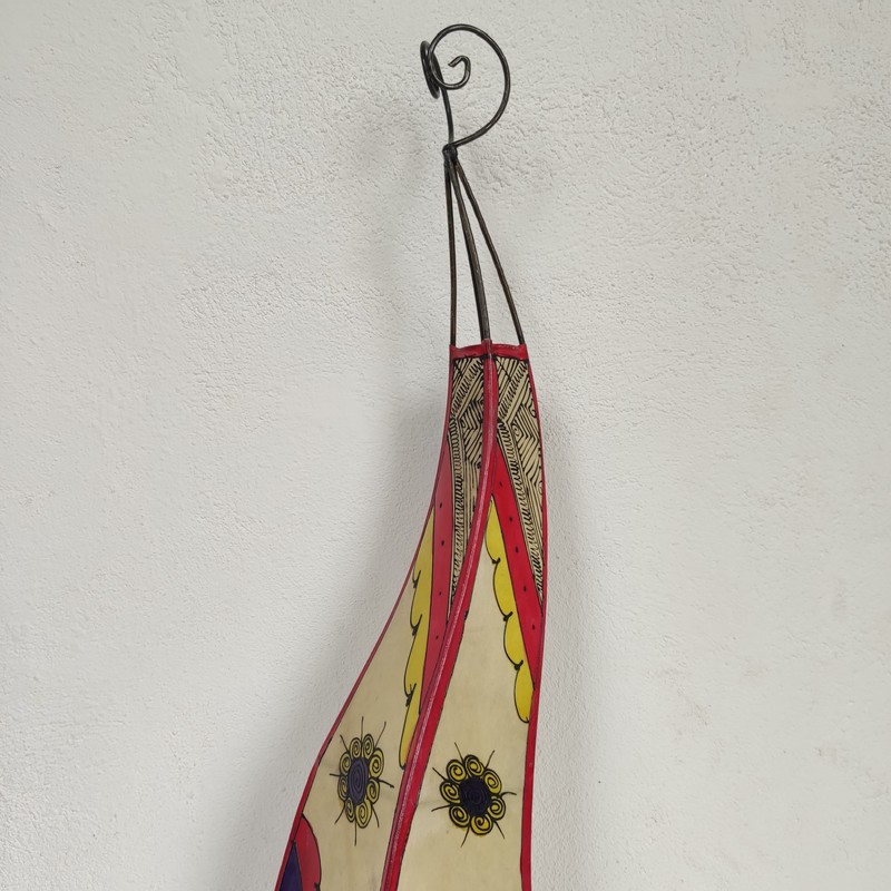 Lámpara de piel natural decorada con henna y pintada a mano en la Medina de Marrakech.