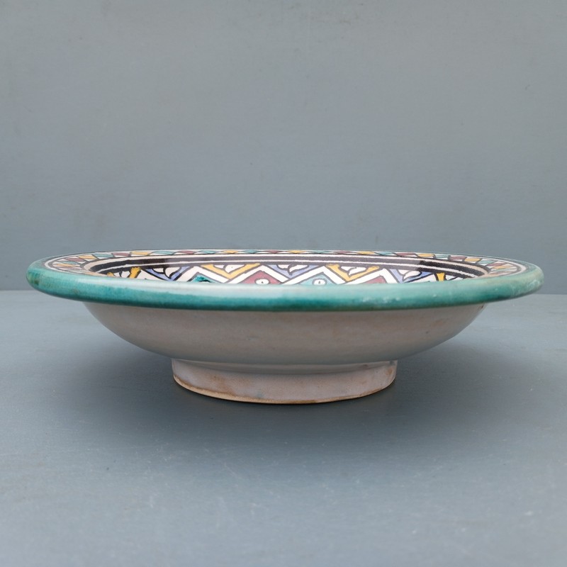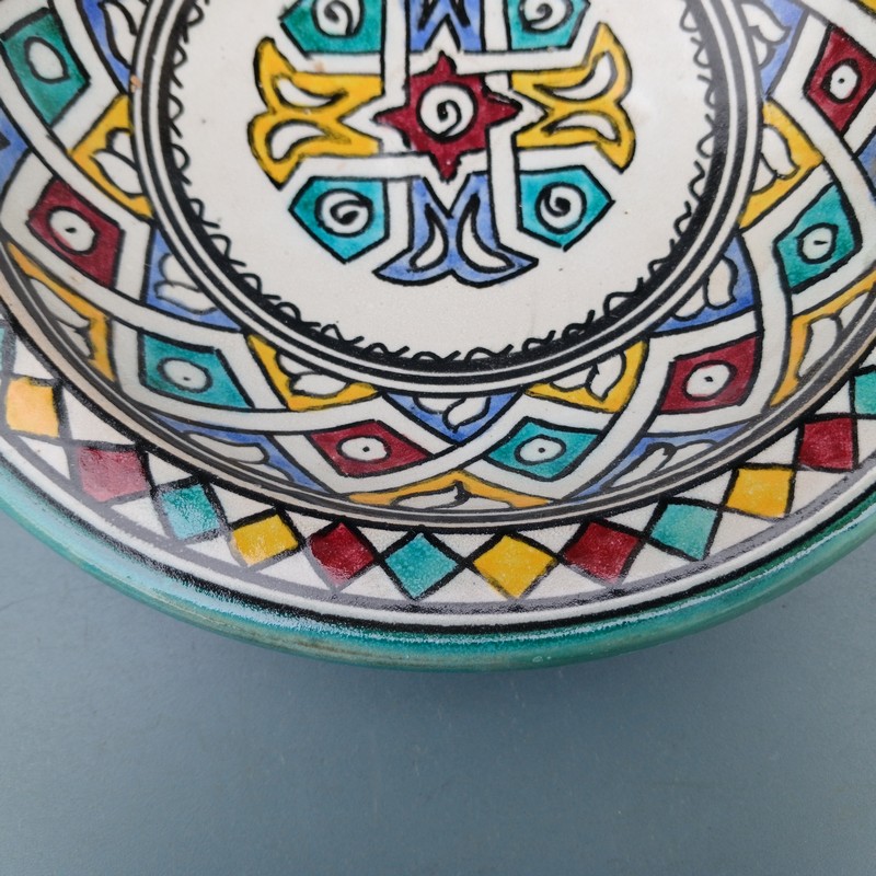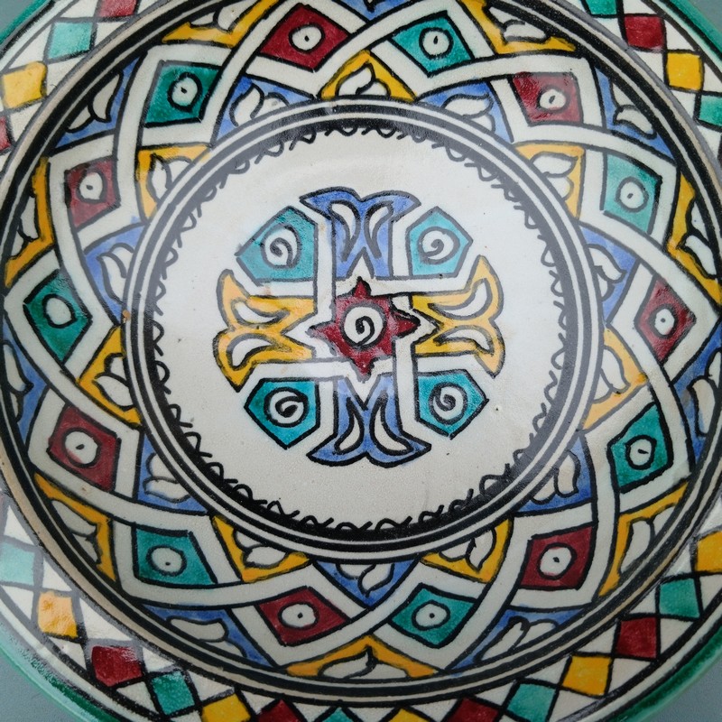 Plato de cerámica marroquí hecho y pintado a mano por los maestros alfareros de la ciudad de Fes. Ideal para decorar una estancia, colgar en nuestro patio o servir nuestra comida favorita.