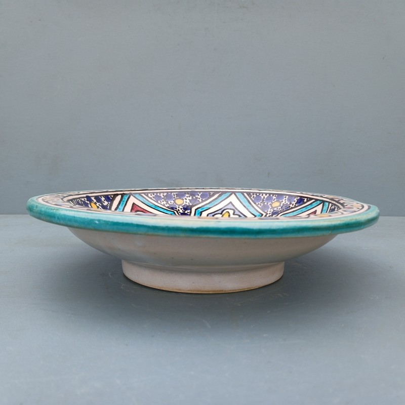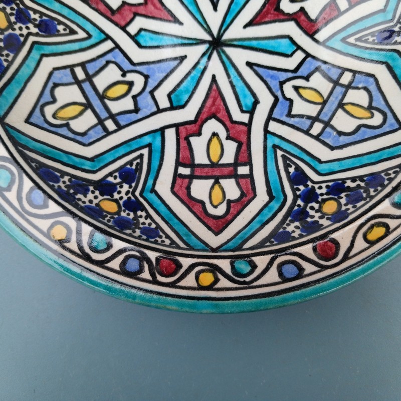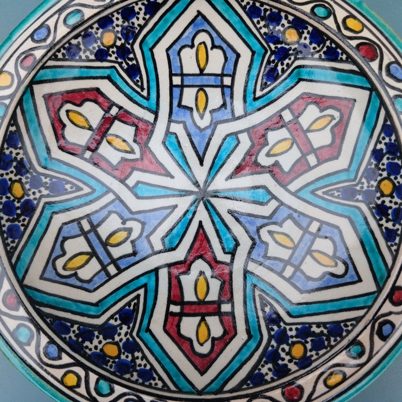 Plato de cerámica marroquí hecho y pintado a mano por los maestros alfareros de la ciudad de Fes. Ideal para decorar una estancia, colgar en nuestro patio o servir nuestra comida favorita.