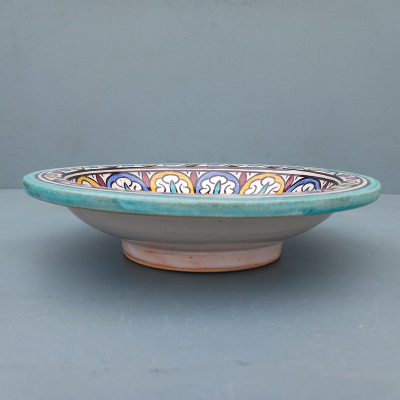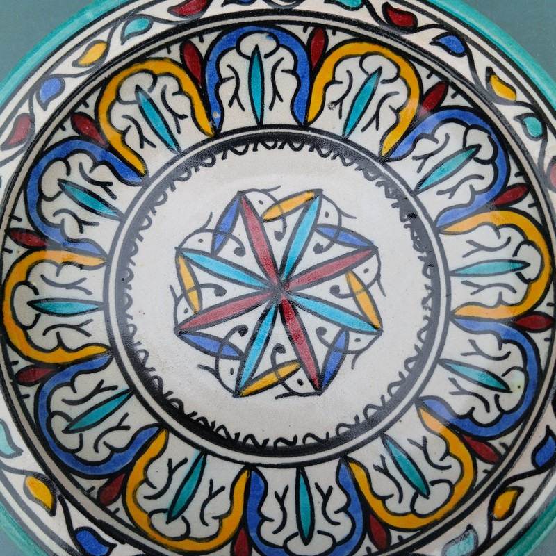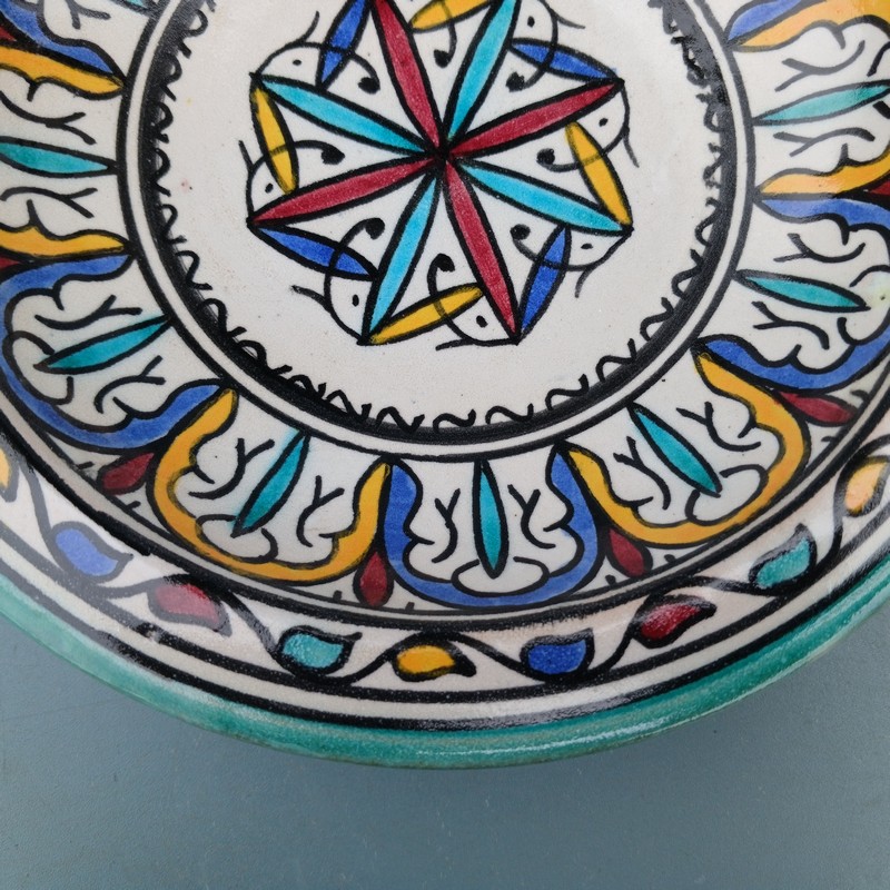 Plato de cerámica marroquí hecho y pintado a mano por los maestros alfareros de la ciudad de Fes. Ideal para decorar una estancia, colgar en nuestro patio o servir nuestra comida favorita.