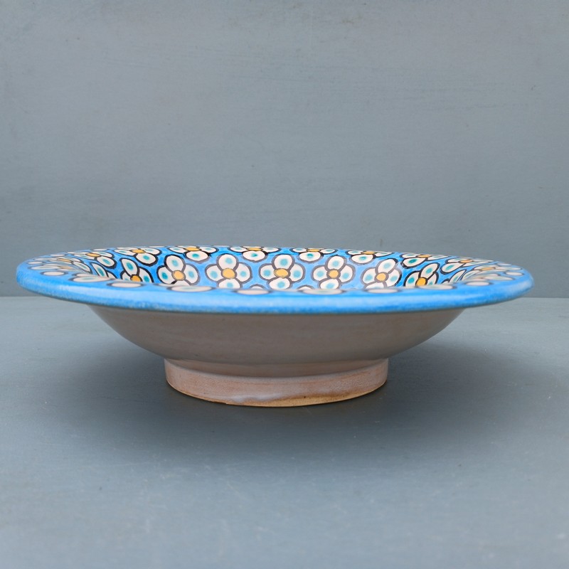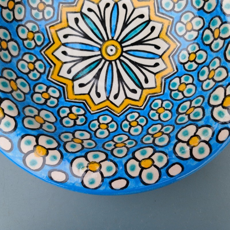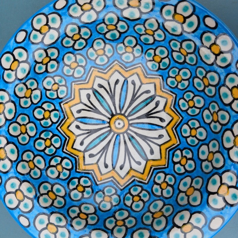 Plato de cerámica marroquí hecho y pintado a mano por los maestros alfareros de la ciudad de Fes. Ideal para decorar una estancia, colgar en nuestro patio o servir nuestra comida favorita.
