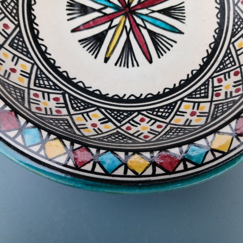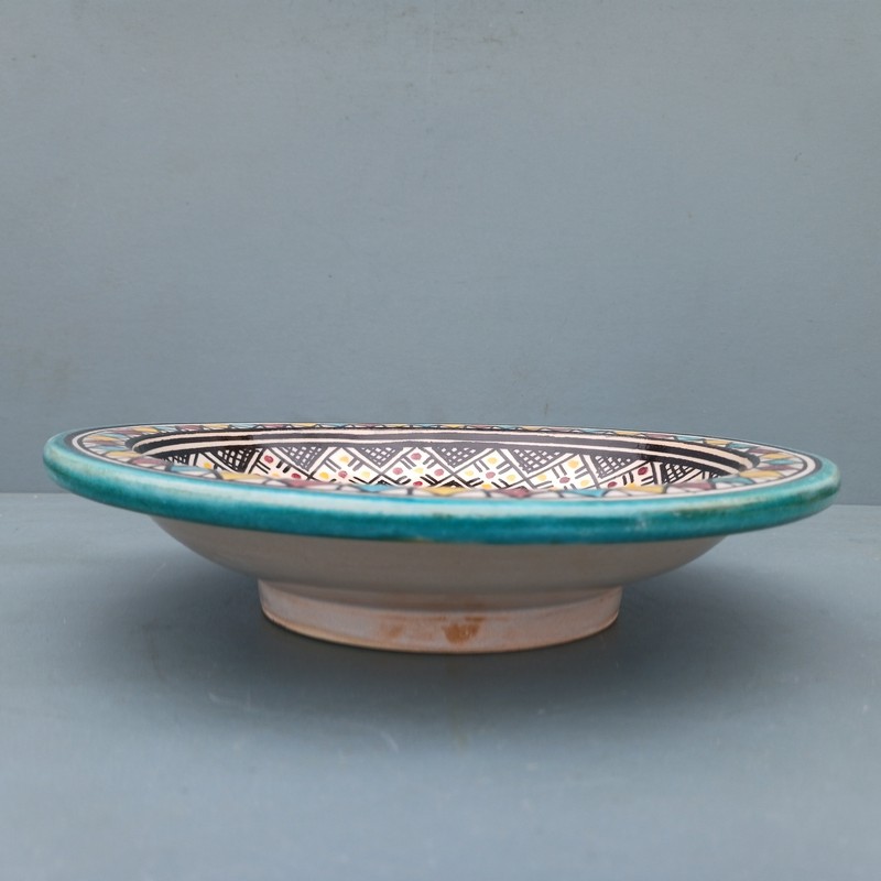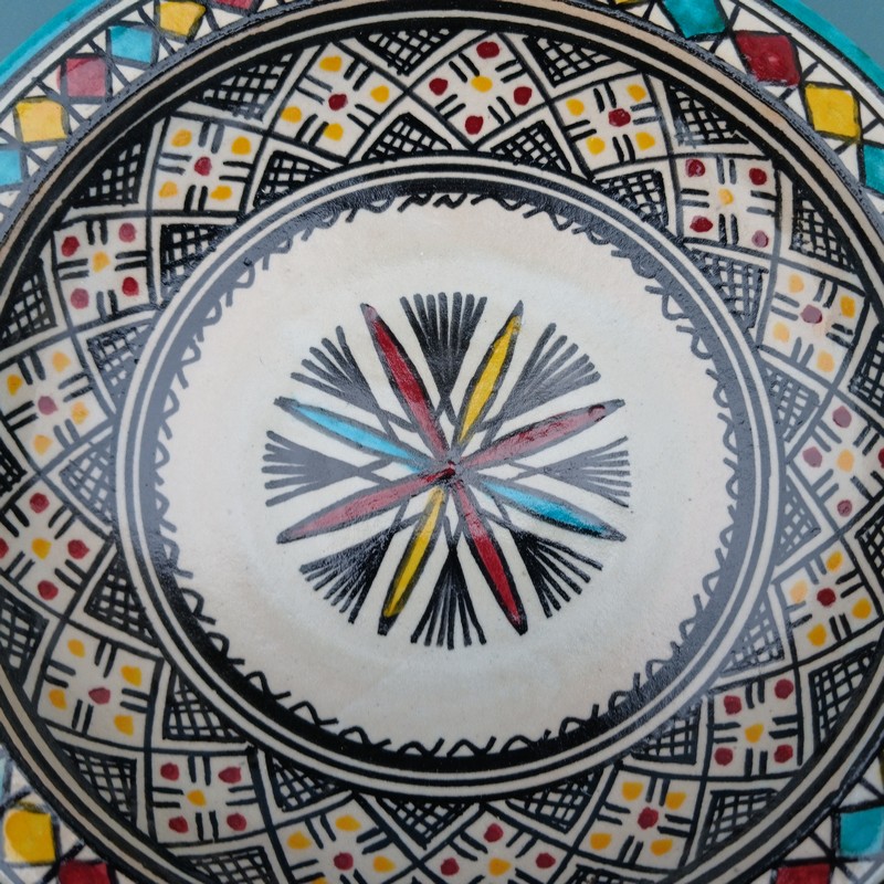 Plato de cerámica marroquí hecho y pintado a mano por los maestros alfareros de la ciudad de Fes. Ideal para decorar una estancia, colgar en nuestro patio o servir nuestra comida favorita.
