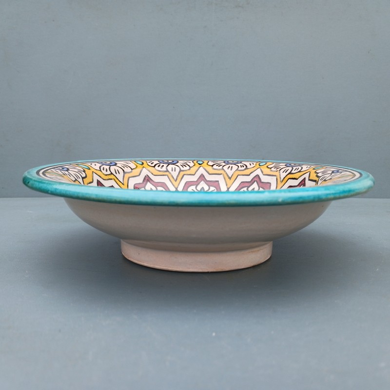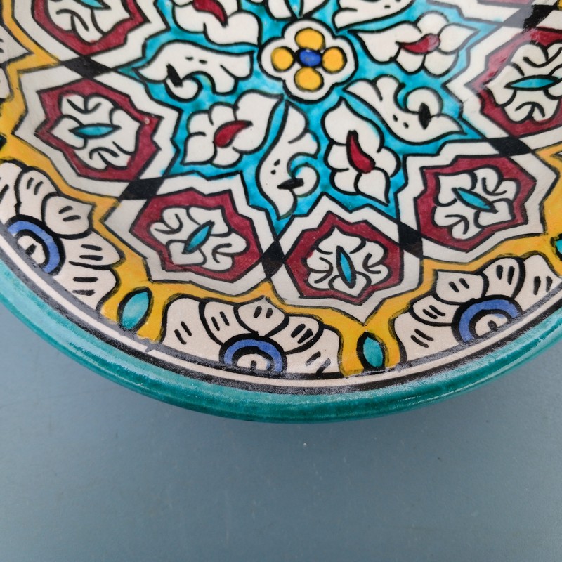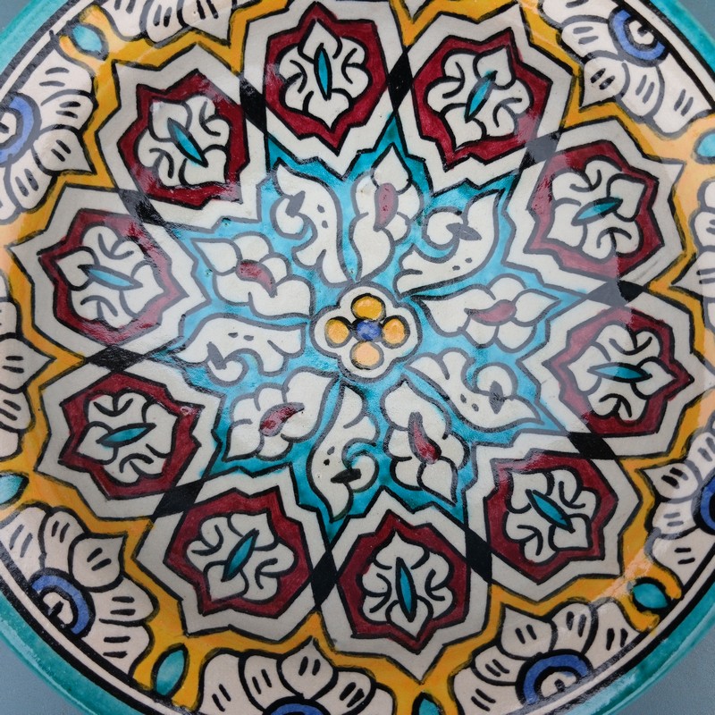 Plato de cerámica marroquí hecho y pintado a mano por los maestros alfareros de la ciudad de Fes. Ideal para decorar una estancia, colgar en nuestro patio o servir nuestra comida favorita.