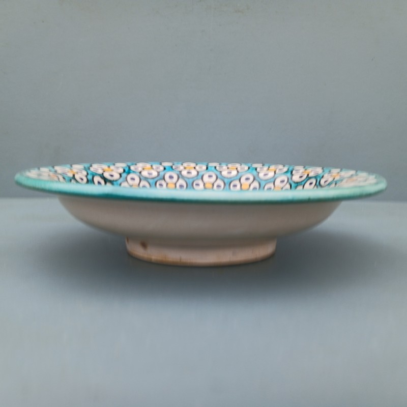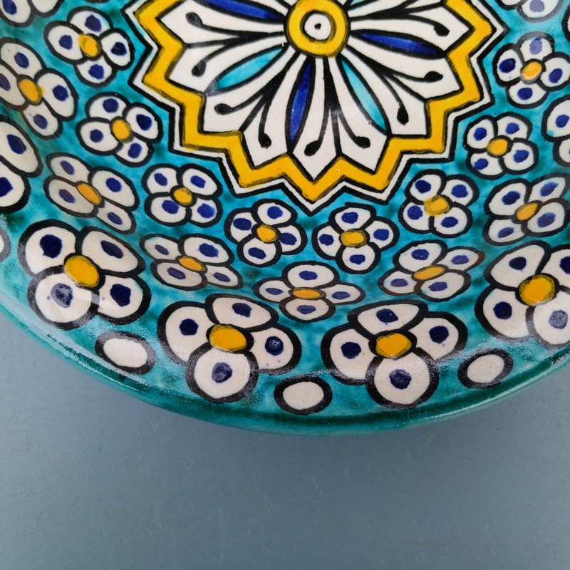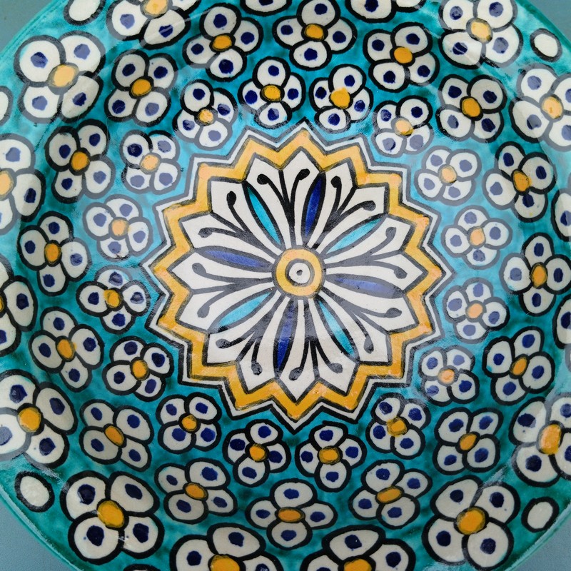 Plato de cerámica marroquí hecho y pintado a mano por los maestros alfareros de la ciudad de Fes. Ideal para decorar una estancia, colgar en nuestro patio o servir nuestra comida favorita.