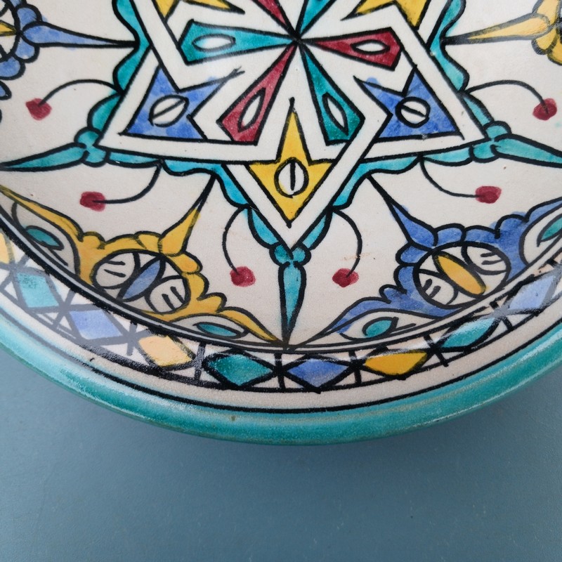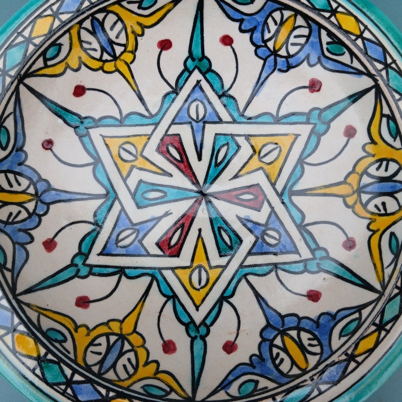 Plato de cerámica marroquí hecho y pintado a mano por los maestros alfareros de la ciudad de Fes. Ideal para decorar una estancia, colgar en nuestro patio o servir nuestra comida favorita.