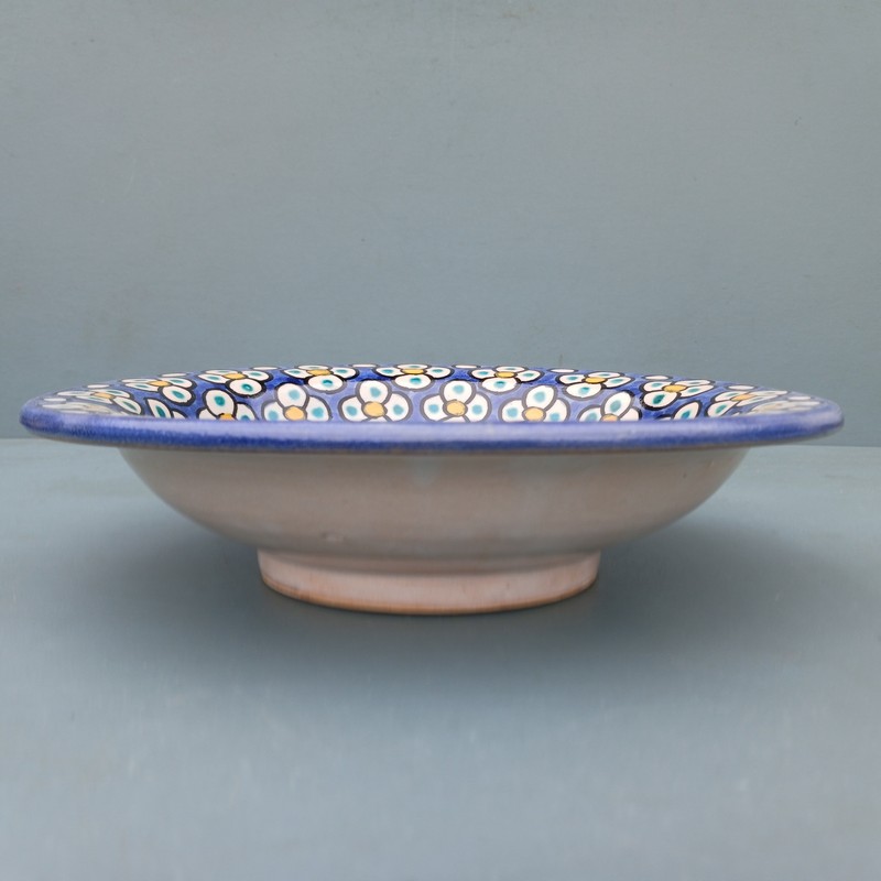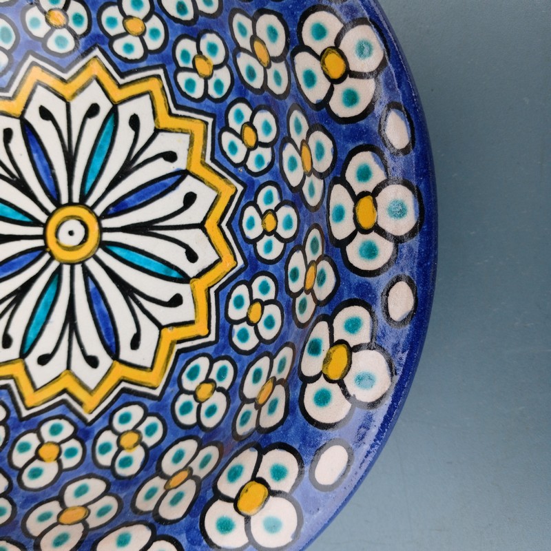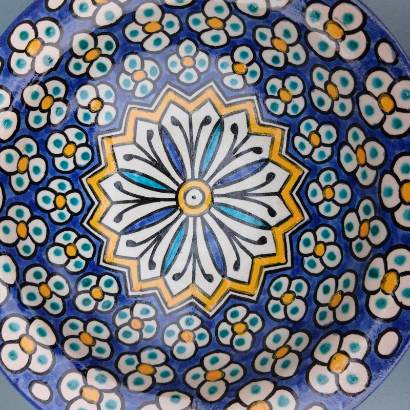 Plato de cerámica marroquí hecho y pintado a mano por los maestros alfareros de la ciudad de Fes. Ideal para decorar una estancia, colgar en nuestro patio o servir nuestra comida favorita.
