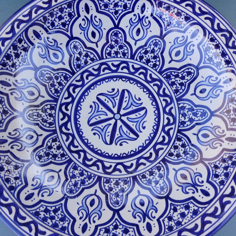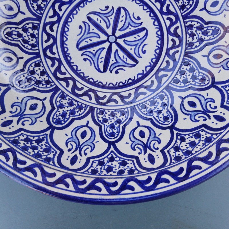 Plato plano de cerámica blanca marroquí de primera calidad, hecho y pintado a mano por los maestros alfareros de la ciudad de Fes. Ideal para decorar una estancia, colgar en nuestro patio o servir nuestra comida favorita.
